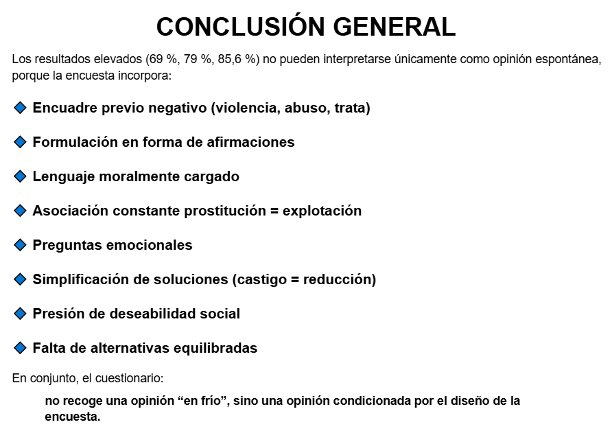 De igual manera hemos compartido ejemplos concretos de errores, sesgos y trampas. La principal es el uso de un diccionario manipulador en el que el abolicionismo nos llama “mujeres prostituidas”. Asumir esa terminología es igual de grave que asumir que la mayoría del trabajo sexual es delictivo cuando es flagrantemente mentira.